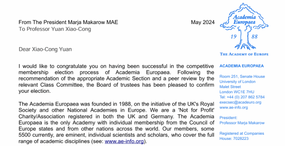 近日,欧洲科学院(Acadamia Europaea)主席Marja Makarow教授致信袁小聪教授,祝贺他当选欧洲科学院院士(MAE)。