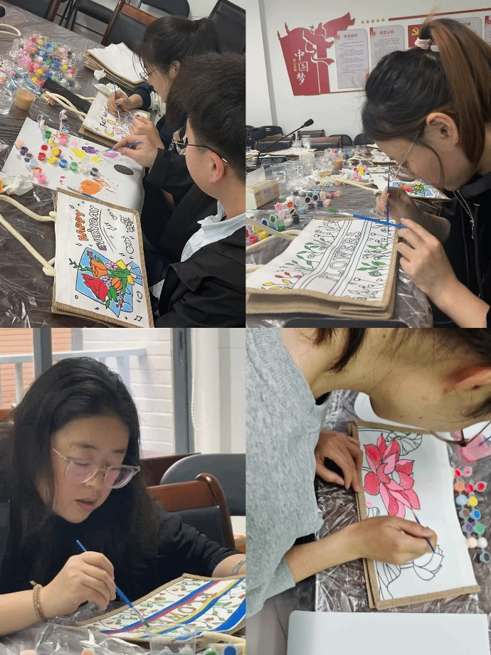 本次活动的DIY手绘包包环节,成为了全场的欢乐焦点,让教职工们的创意与巧思尽情绽放。活动准备了简约的帆布包、色彩丰富的丙烯颜料与各式画笔,大家围坐在一起,化身“创意设计师”,开启专属的手绘创作。手持画笔蘸取心仪的颜料,在包包侧边细细勾勒、慢慢描绘,或绘上春日繁花、清新绿植,或画下可爱图案、暖心文字,也有教职工将微纳光电的科研元素融入创作,让包包兼具个性与专属意义。