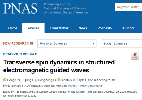 近日,我校微纳光电子学研究院袁小聪教授领导的纳米光子学研究中心在自旋光子学领域取得了重要原创成果,于2021年2月1日在国际顶级学术期刊美国科学院院报《Proceedings of the National Academy of Sciences of the United States of America》上发表了题为《Transverse spin dynamics in structured electromagnetic guided waves》的文章。该中心石鹏助理教授、杜路平教授为共同第一作者,杜路平教授、袁小聪教授以及英国伦敦大学国王学院Anatoly. V. Zayats教授为共同通讯作者,深圳大学是该文章的第一单位和第一通讯单位。