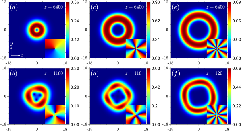 图 1 稳定(a, c, e)和不稳定(b, d, f)涡旋孤子传播模拟