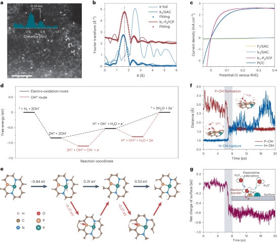 毒化实验和准原位光谱分析证明了P原子位点上吸附的*OH参与到HOR反应路径当中,密度泛函理论(DFT)计算和分子动力学(AIMD)模拟进一步揭示了*OH在P上的吸附不仅降低了Ir原子位点上*H的吸附能,并且将*H的脱附由依赖于外加电势的电化学步骤转变为室温下可发生的热力学过程(图2d−g),从而促进了Ir1−P1/ICP上HOR的反应动力学。