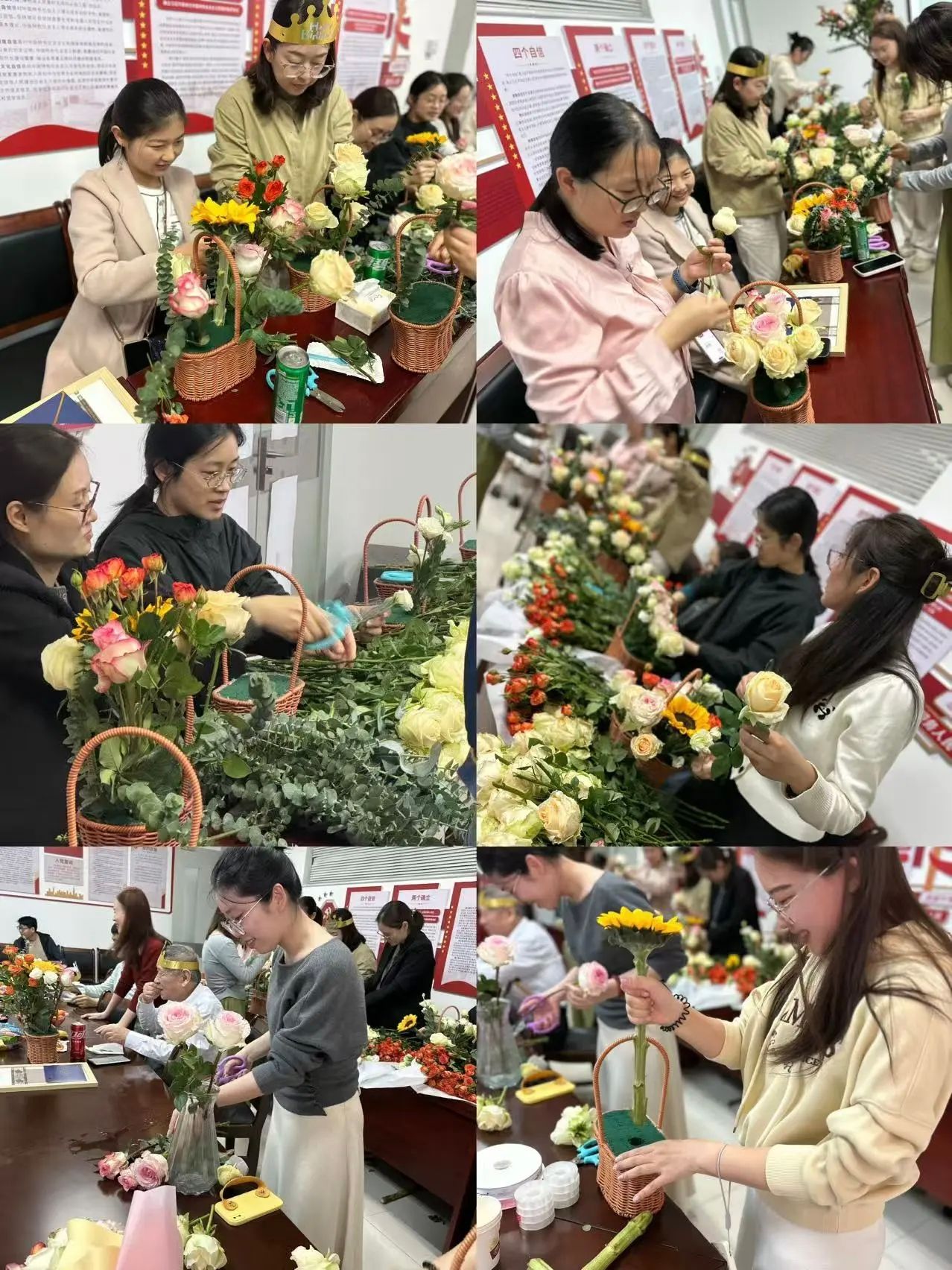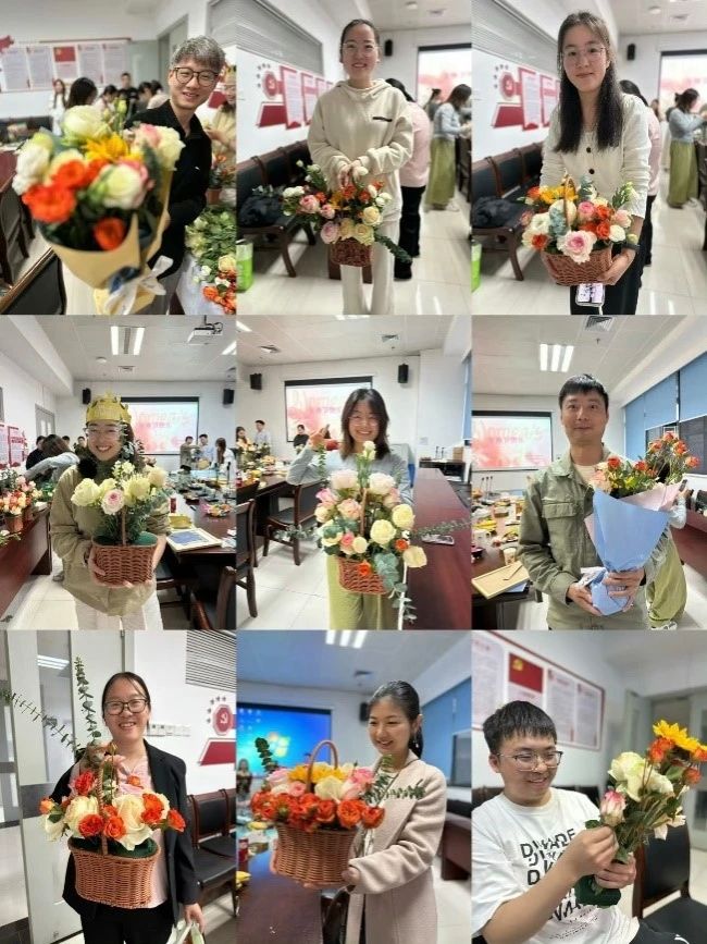 无论男女老师都纷纷投入其中,无论是经验丰富的“花艺高手”还是初学者,都在这场自由发挥的比拼中找到了属于自己的乐趣。虽然没有花艺师的指导,老师们却展现出了惊人的创造力。他们互相交流、互相启发。每个花篮都展现出或浪漫与温馨或高雅与清新,每一份都是独一无二的花艺作品。