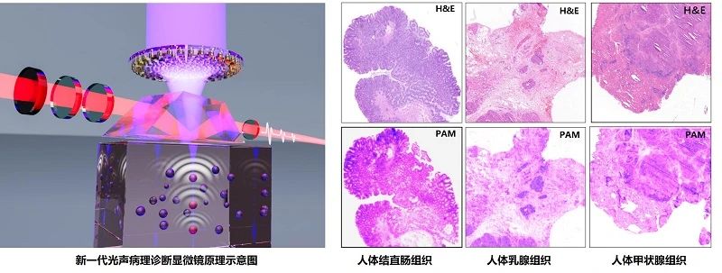 术中快速获取肿瘤切缘等关键病理学信息,对恶性肿瘤的术中诊疗至关重要。目前术中病理冰冻切片需要经历冰冻、切片和染色等复杂的样品制备步骤,同时还存在组织结构易损和难以辨别微小浸润(早期病变)等诸多缺陷。围绕术中快速精准病理诊断的迫切需求,本项目研制了新一代光声病理诊断显微镜,通过解决高灵敏宽带光声探测、大焦深高分辨紫外激发、快速光学扫描采集等核心技术问题,实现了新鲜组织样本的高分辨率、高对比度、高特异性成像,从形态结构和光声声谱等多个角度揭示了组织样本的病理学特征。目前,研究团队已经在天津市人民医院和深圳市第二人民医院开展预临床工作,完成了百余例结直肠、乳腺、骨质、肾脏、甲状腺等组织的光声病理诊断。预临床实验结果显示,该光声病理诊断技术仅需5分钟即可获得组织样本图像,病理诊断结果与H&E染色金标准高度吻合。相对于传统组织病理检测方法,该技术不仅具备无标记、无损伤、免切片、快速、多维信息等优势,而且其独特的光声谱解析能力还可区分结直肠微小浸润组织,适用于术中早期癌变的病理诊断。因此,该新一代光声显微镜将为恶性肿瘤的术中快速精准病理诊断提供创新变革工具。